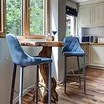 Koupelna má samostatnou toaletu a sprchu, zatímco pokoj má přístroj na přípravu kávy a čaje, místnost na posezení, televizi.